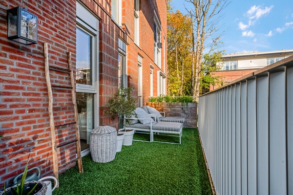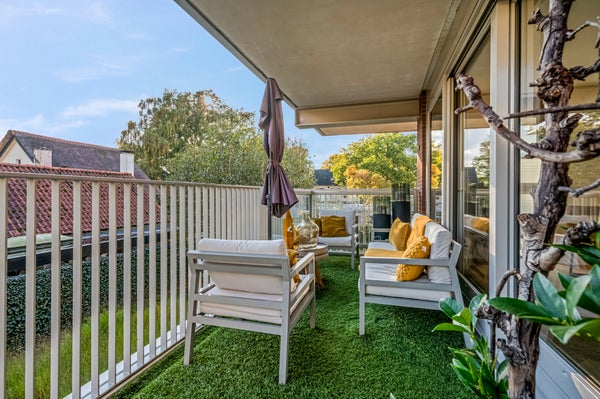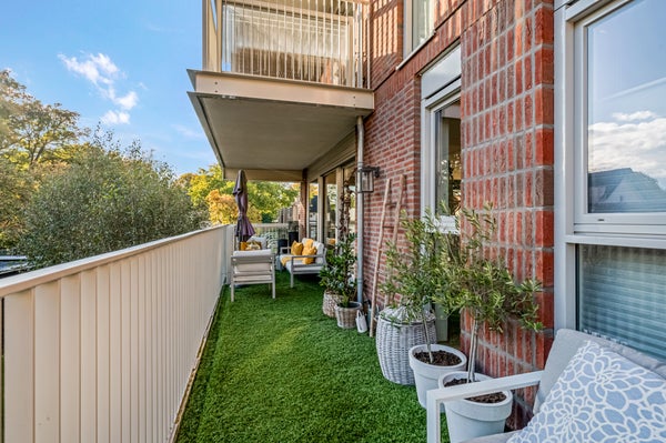 Vanuit de keuken is het balkon aan de voorzijde te bereiken, met mooi uitzicht naar de rustige Ericalaan. Het tweede, meer dan 10 meter brede balkon grenst aan de woon-/eetkamer. Dit is een fantastische buitenruimte met een uitstekende zonligging en veel privacy. Het balkon is voor de helft overdekt en op het beton is kunstgras van hoge kwaliteit gelegd. Dankzij het op afstand bedienbare elektrische windscherm geniet je van optimaal zitcomfort.