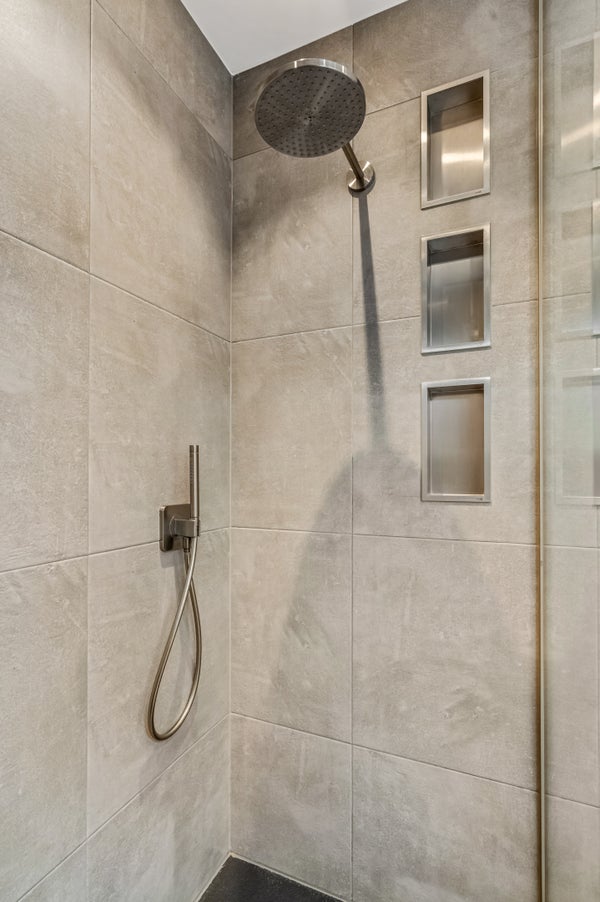 De royale master bedroom, met een eigen badkamer en een kledingkamer, heeft een prachtige en rustige ligging aan de achterzijde. Er ligt, net als in bijna het hele appartement, een houten vloer in visgraatmotief en ook hier ziet u ramen tot vloerhoogte en inbouwverlichting. De bijbehorende badkamer is uitgevoerd met een grote inloopdouche, een badmeubel met twee wastafels en een wandcloset. De afwerking met onder andere Axor-kranen en een douchesysteem gecombineerd met het verfijnde kleurgebruik, maken van deze badkamer een echte droombadkamer.