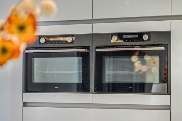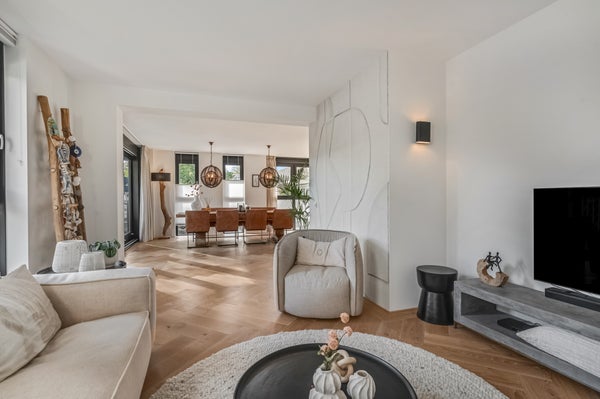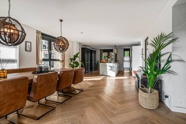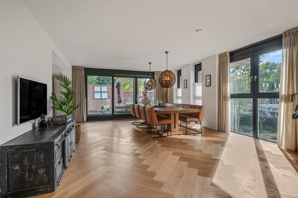 De woon-/eetkamer met open keuken is een prachtige leefruimte met ramen tot vloerhoogte en een schuifpui naar het balkon. Geniet van het uitzicht en van de aangename sfeer, mede dankzij de donkere kozijnen en de visgraatvloer. Het eetgedeelte heeft een zeer royale opzet, net als het aparte tv-gedeelte waar de wandafwerking kunstzinnig mooi is.