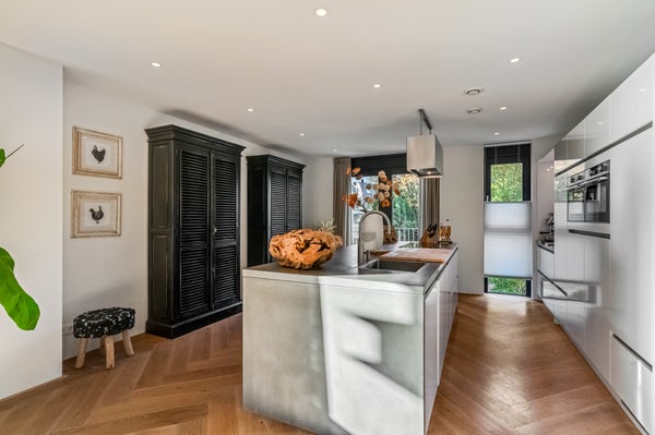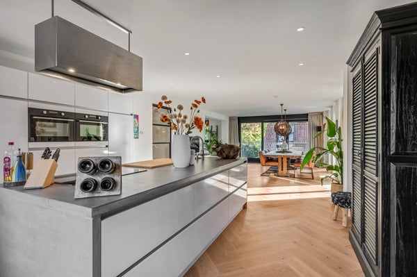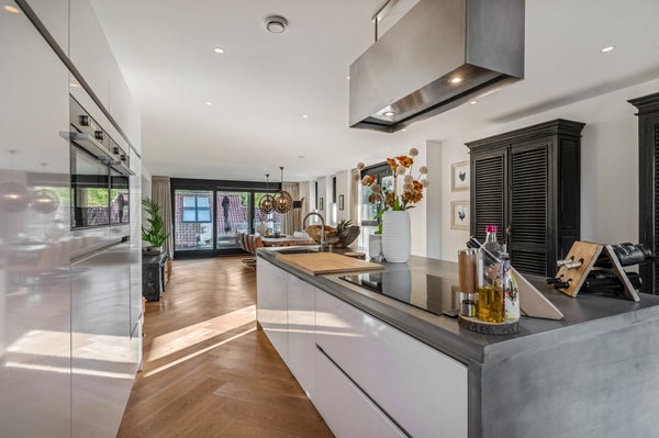 In 2018 is de exclusieve keuken geplaatst met een hoge kastenwand, een koffiecorner en een groot kook-/spoeleiland. Het betonnen blad geeft de keuken een stoere uitstraling en alle denkbare apparatuur van topkwaliteit is ingebouwd: een inductie kookplaat, design afzuigkap, Quooker, vaatwasser, combi-oven, combimagnetron, koelkast en een vriezer. Dubbele deuren in de keuken geven toegang tot het balkon aan de voorzijde.