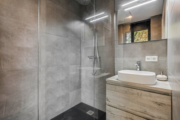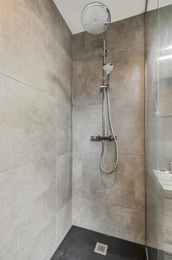 De slaapkamer aan de voorzijde is in gebruik als tweepersoons logeerkamer en de bijbehorende badkamer is ingedeeld met een inloopdouche en een badmeubel. Fraaie elementen zijn de regendouche met losse handdouche, de spiegel met verlichting en de grote wandtegels.