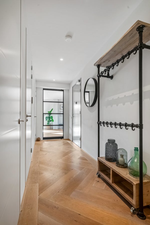 Recht tegenover de lift is de entree van het zeer royale appartement. In de ontvangsthal ligt een fraaie houten vloer in een visgraatmotief. Deze vloer vormt een fraai geheel met de stijlvolle binnendeuren en taatsdeur. Vanuit de hal heeft u onder andere toegang tot een bergkast, het gastentoilet met luxe sanitair en een inpandige berging/wasruimte.