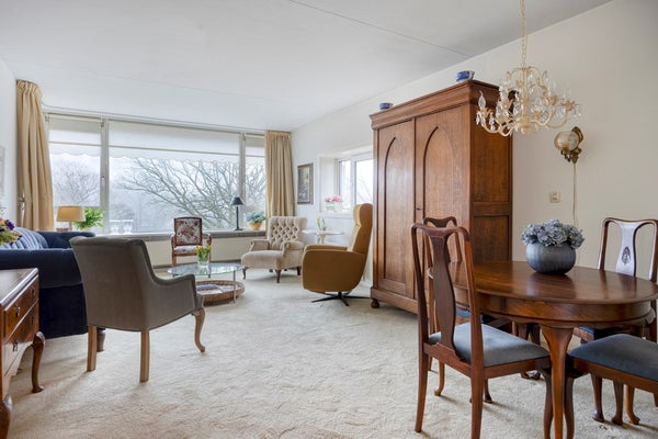 De ruime, open woonkamer wordt gekenmerkt door een prettige lichtinval die de ruimte een frisse en aangename sfeer geeft. Hier heeft u volop mogelijkheden om een comfortabele zithoek en een gezellige eethoek te creëren, geheel afgestemd op uw woonwensen. Dankzij de directe toegang tot het balkon loopt binnen naadloos over in buiten, wat het woongenot nog eens extra vergroot. Het fraaie uitzicht op de bosrijke omgeving vanuit zowel de woonkamer als het balkon maken dit tot een heerlijke ruimte.