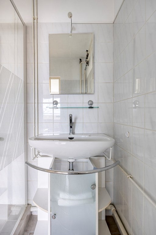 De badkamer is volledig betegeld en netjes afgewerkt. U beschikt hier over een ruime douchecabine, een wastafel met spiegel en een opbergmeubel. Daarnaast is de witgoedaansluiting hier gesitueerd, wat het geheel praktisch en efficiënt maakt. De separate toiletruimte is eveneens verzorgd uitgevoerd en vergroot het comfort van de woning.