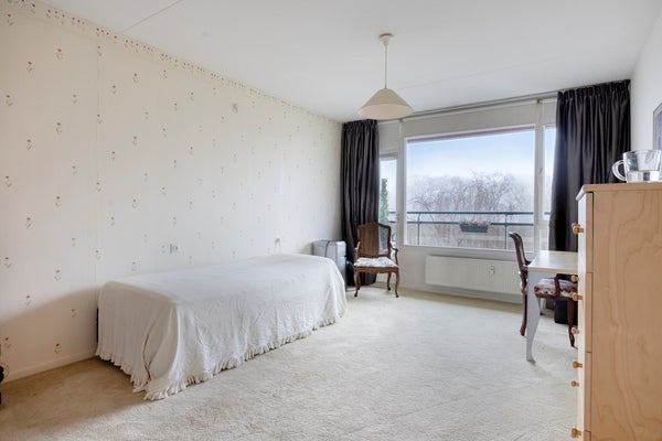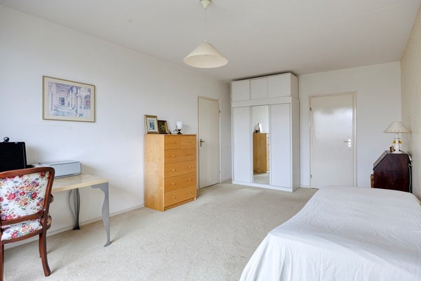 De ruime slaapkamer biedt meer dan voldoende plaats voor een comfortabel bed, een royale kast en eventueel een bureau. Daarmee leent deze kamer zich niet alleen uitstekend als slaapvertrek, maar ook als thuiswerkplek. De directe toegang tot het balkon zorgt voor extra licht en een prettige verbinding met buiten, wat bijdraagt aan een ontspannen en open sfeer.