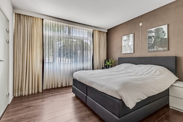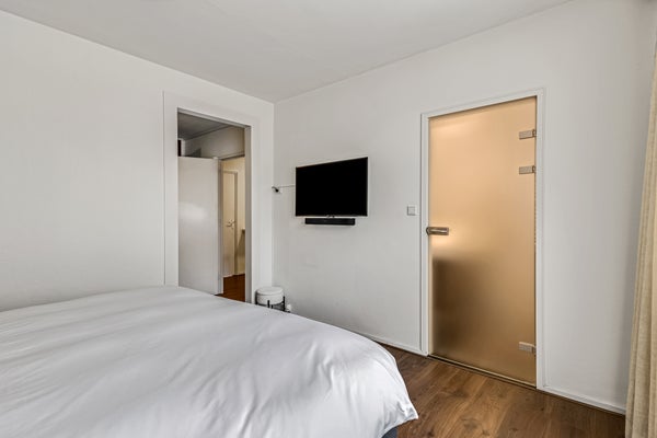 De slaapkamer heeft de uitstraling van een boutique-hotel en grenst aan een ruime kleedkamer – ideaal als walk-in closet. Verder is vanuit de slaapkamer de en-suite badkamer bereikbaar, compleet met inloopdouche en stijlvol wastafelmeubel.