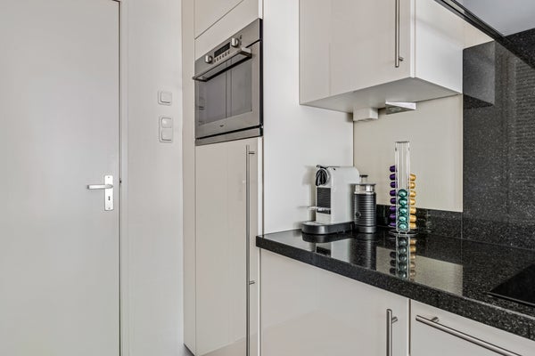 De keuken is modern en licht, met een granieten werkblad, inbouwapparatuur (inductiekookplaat, afzuigkap, combi-oven, koelkast en vaatwasser) en een inbouwkast voor de wasapparatuur. Vanuit hier bereik je het tweede balkon.