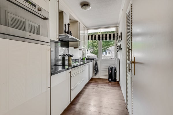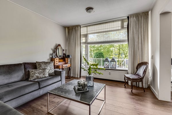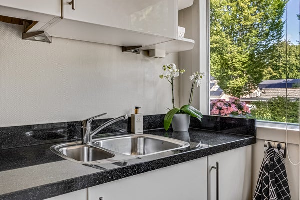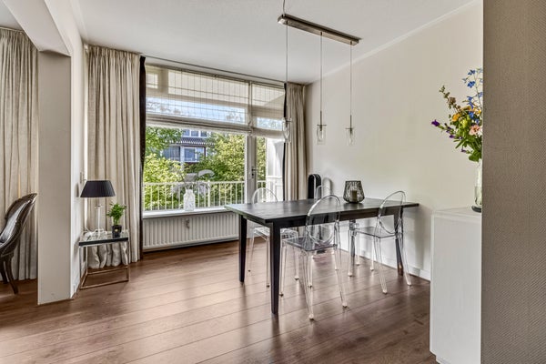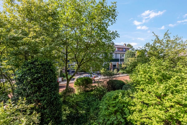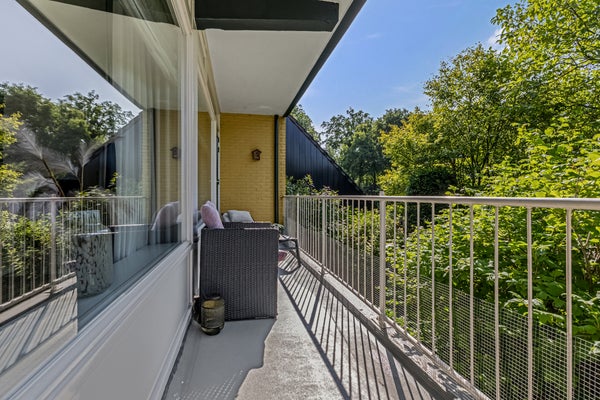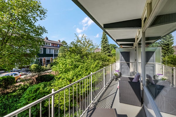 Vanuit de woonkamer en eetkamer is het circa 7 meter brede balkon te bereiken. De ligging op het zuiden is perfect voor de zonliefhebber, en het uitzicht naar het groen is fraai. Aan de kant van de keuken is een tweede balkon, waar je op het warmste moment van de dag in de schaduw kunt zitten. Daarnaast is er een prachtig onderhouden, gedeelde tuin waar bewoners samen van kunnen genieten. Het groene geheel biedt een rustige en prettige sfeer, ideaal om even buiten te ontspannen.