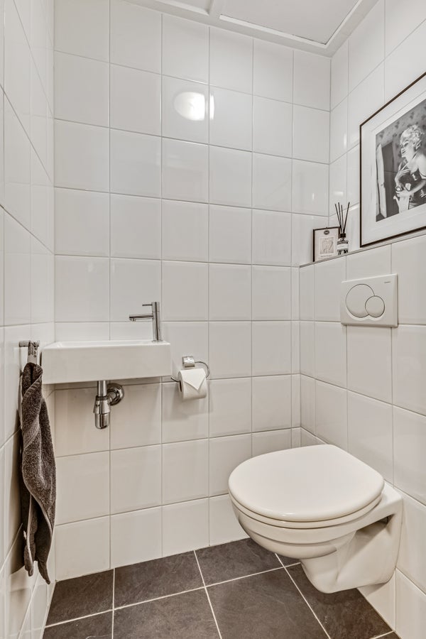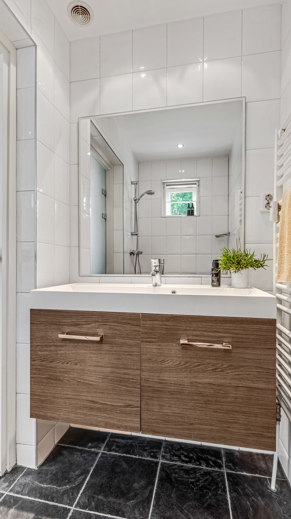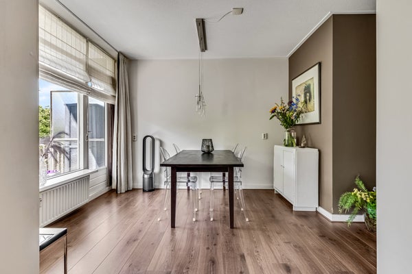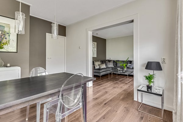 Bij binnenkomst valt direct de ruimte en sfeer op. De hal is ruim en stijlvol, met een praktische inbouwkast naast de meterkast en een toiletruimte in rustige kleuren. De woonkamer en eetkamer liggen aan de zuidzijde en baden in het licht. Het laminaat met witte plinten en de strakke afwerking geven de ruimte een moderne uitstraling, terwijl de brede raampartijen uitzicht bieden op het groen.
