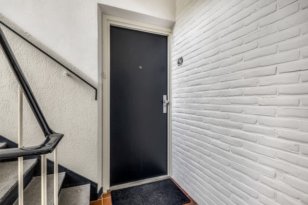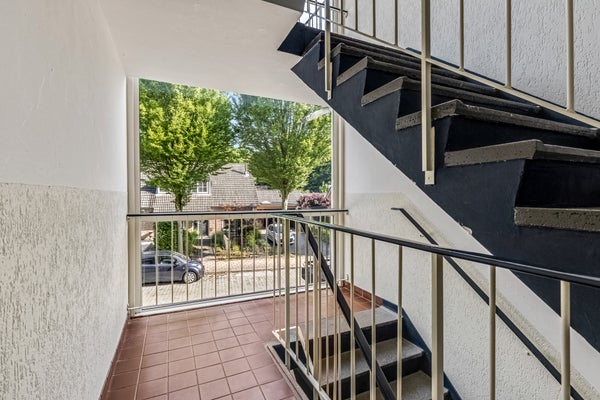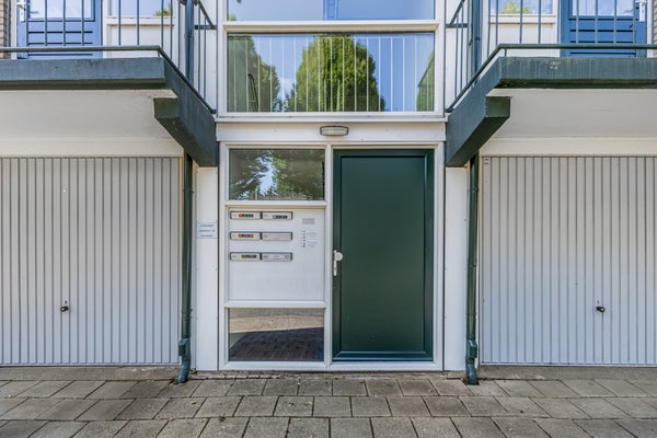 Het appartement maakt deel uit van een kleinschalig complex met slechts twaalf appartementen. De entree (die gedeeld wordt met zes appartementen) met bellentableau, brievenbussen en intercom bevindt zich aan de buitenzijde. Een trap leidt naar de eerste verdieping, waar dit hoekappartement zich aan de linkerzijde bevindt.