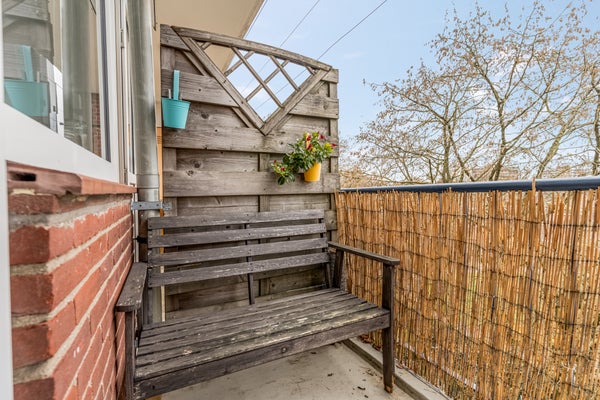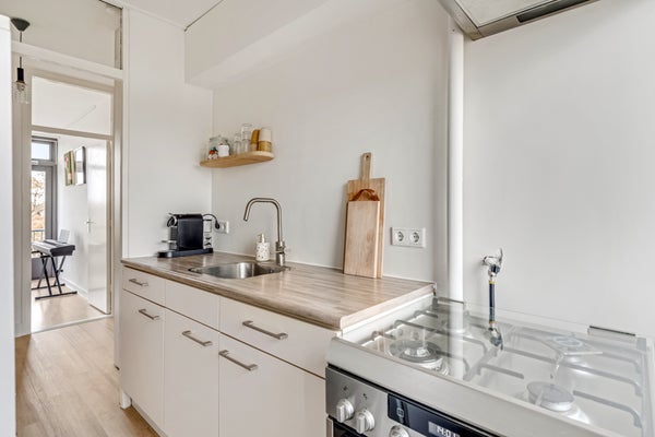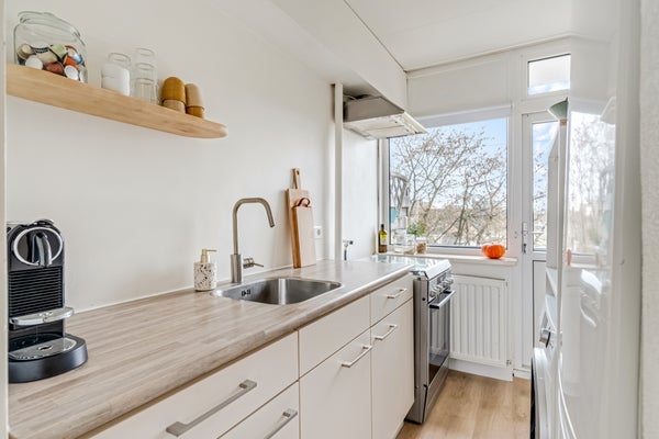 De keuken is aan de achterzijde, met toegang tot een balkon op het westen. Het nette keukenblok heeft een houtlook aanrechtblad, een spoelbak en een mooie kraan. Het gasfornuis met oven, de afzuigkap en de vaatwasser blijven achter waardoor je als nieuwe eigenaar een vliegende start maakt. De hoge koel-/vriescombinatie wordt ter overname aangeboden.