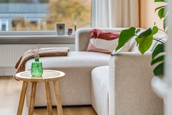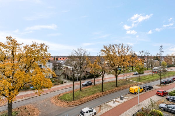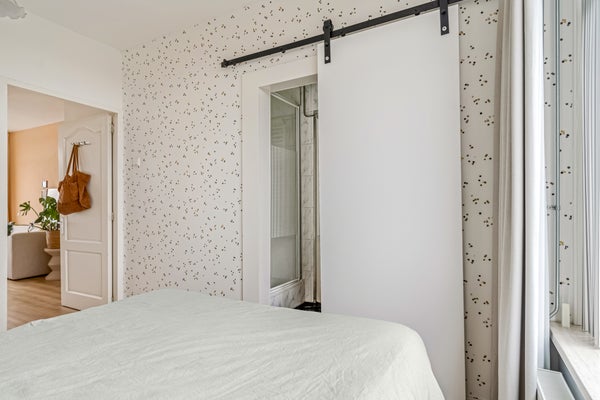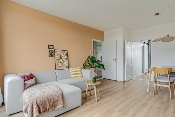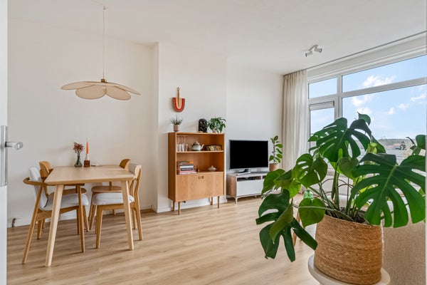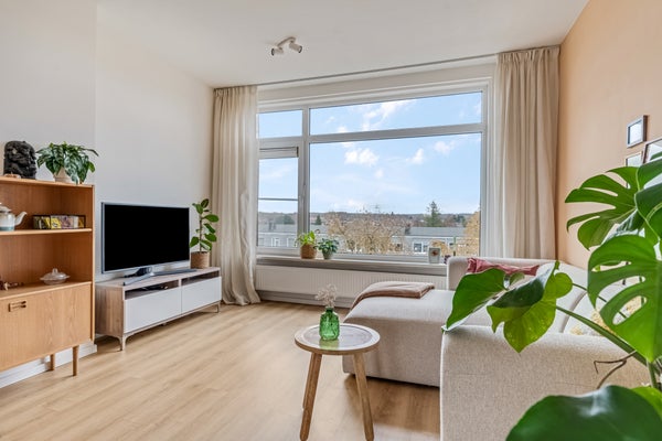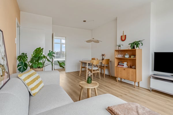 Naast de toiletruimte is de deur naar de woonkamer, waar je volop geniet van de zon die naar binnen valt. Niet alleen in de ochtend, maar ook in het begin van de middag. Een ander pluspunt is de ligging op de bovenste verdieping, waardoor je in de verte de contouren van het bos ziet. Qua indeling is er genoeg plek voor een lekkere bank, een tv-meubel, de eettafel en je mooiste woonaccessoires.