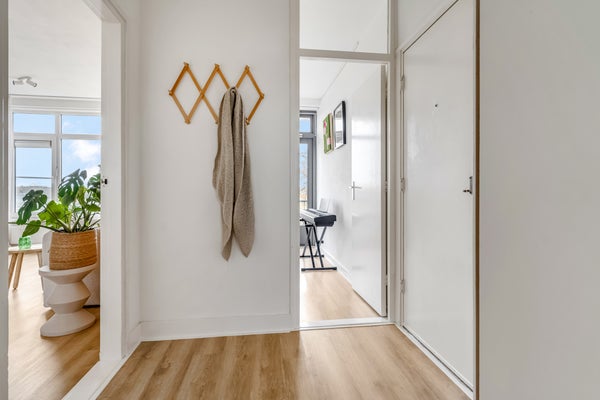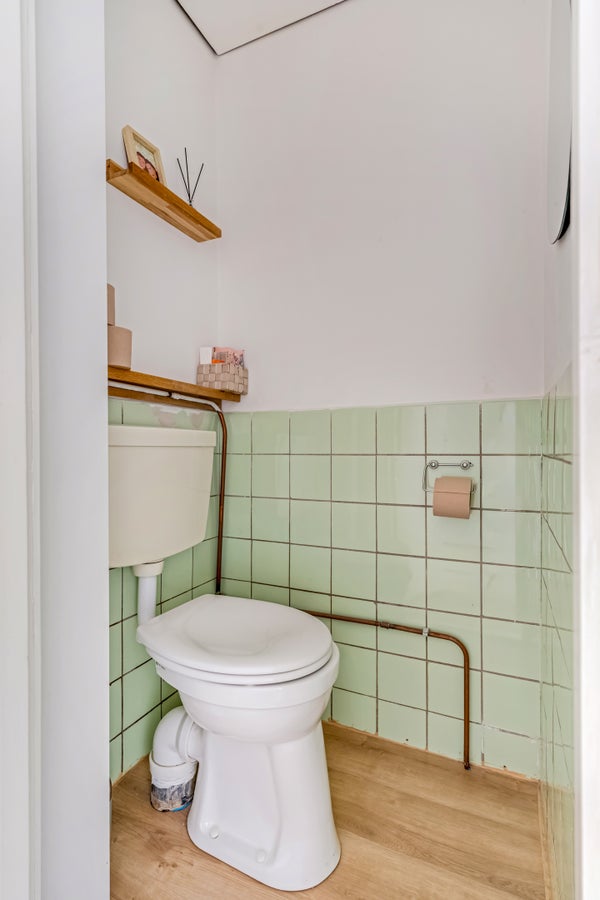 In de hal ligt een houtlook pvc-vloer, net als in bijna het hele appartement. Naast de voordeur is de meterkast en achter een van de deuren is de toiletruimte, waar de originele wandtegels zijn behouden.