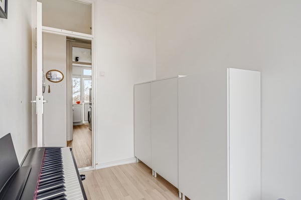De tweede slaapkamer, in gebruik als hobby- en bergruimte, is aan de voorzijde. Een indeling met een bed en een kledingkast is ook mogelijk, wat het appartement ook geschikt maakt voor een jong gezin.