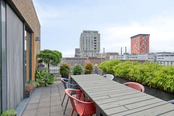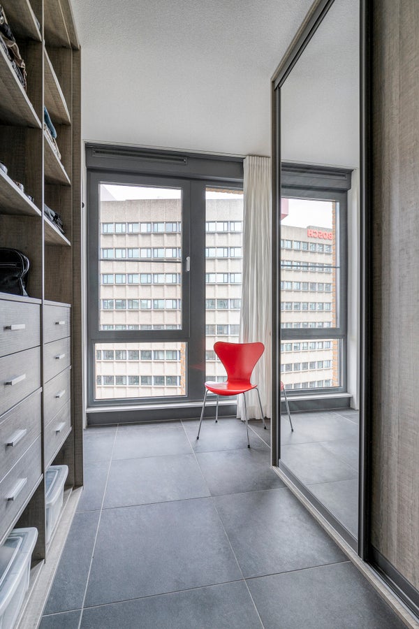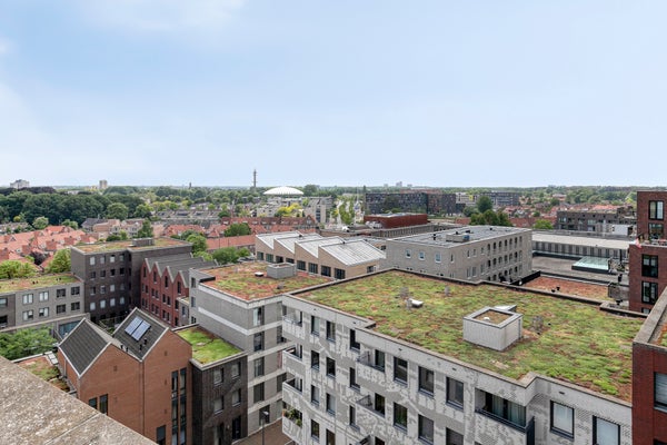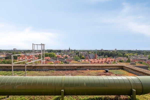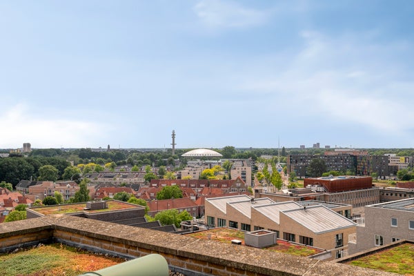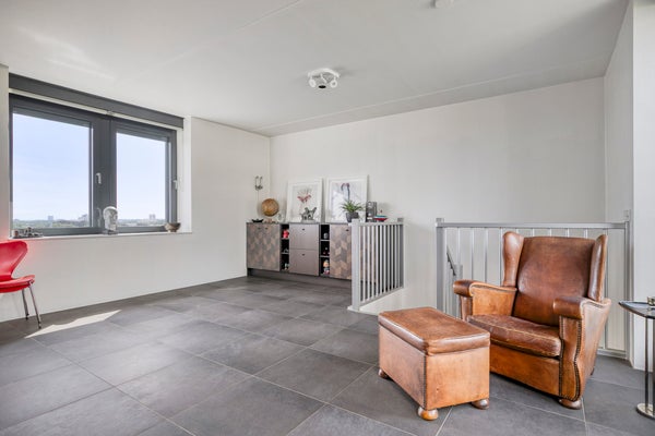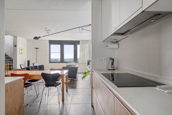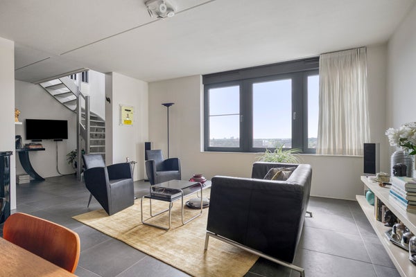 Op de 8e en 9e verdieping van Strijp-S vind je dit unieke 3-kamer penthouse van ca. 145 m². Het appartement heeft een speelse indeling en een hoogwaardige afwerking, met een indrukwekkend dakterras dat een panoramisch uitzicht biedt. Via een lift bereik je de hal met stijlvolle tegelvloer, waar je naar de lichte woonkamer gaat, ideaal voor ontspanning. De open keuken is luxe ingericht en biedt diverse inbouwapparatuur. De slaapkamer beschikt over een badkamer "en suite" met dubbele wastafel en inloopdouche, en een aparte dressingroom. Een vaste trap leidt naar de multifunctionele bovenverdieping, die kan dienen als kantoor of extra slaapkamers. Wonen in Strijp-S betekent toegang tot een levendige buurt met restaurants, cafés en cultuur.