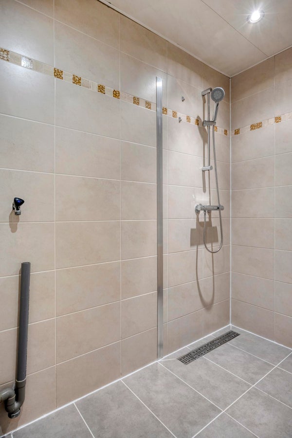 De badkamer is volledig betegeld en voorzien van douche en een wastafel.
