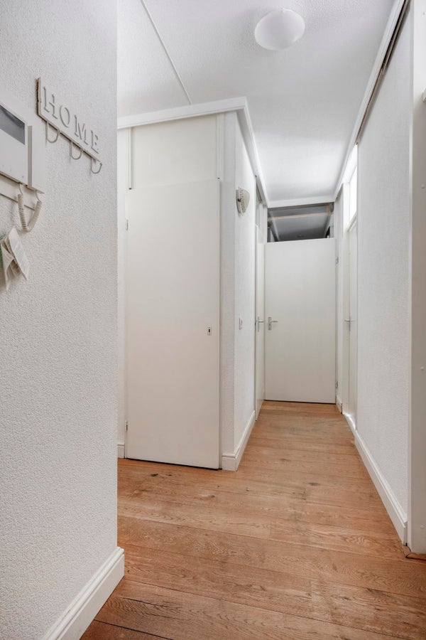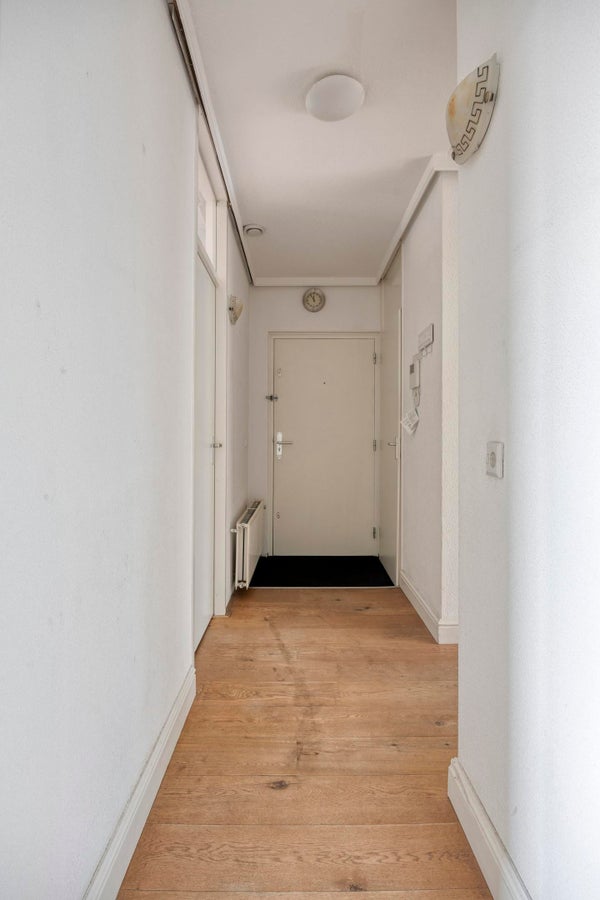 Via de centrale entree bereik je het appartement. De hal is ruim en overzichtelijk en biedt toegang tot alle vertrekken. Hier is voldoende ruimte voor een garderobe en extra opbergmogelijkheden.