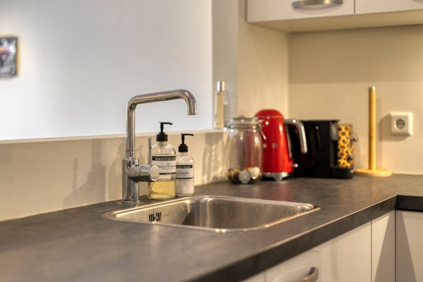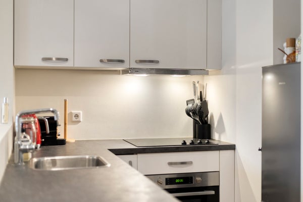 De keuken (2019) is uitgevoerd in een praktische hoekopstelling met onder- en bovenkasten en een kunststof werkblad. De keuken is voorzien van een spoelbak, vaatwasser, combi-oven, keramische kookplaat en een losse koel-vriescombinatie.