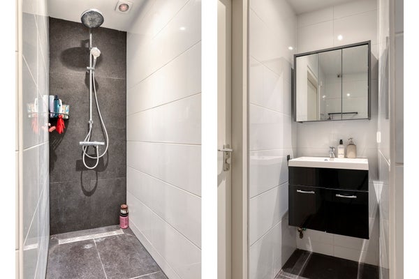 De badkamer is volledig betegeld en voorzien van een regendouche met thermostaatkraan en een wastafel met meubel en spiegel.