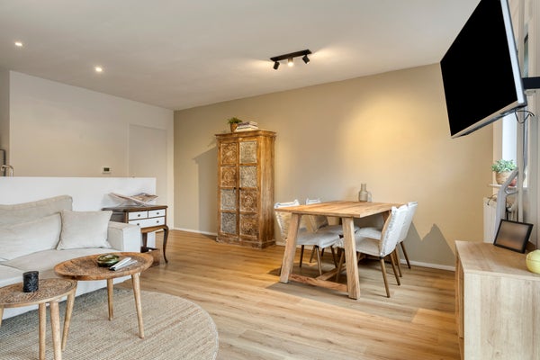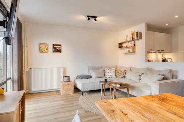 De woonkamer is licht en sfeervol afgewerkt. Dankzij de grote raampartij is er een prettige lichtinval en een mooi uitzicht richting de straatzijde en het groen. De ruimte biedt voldoende plaats voor een zit- en eetgedeelte.