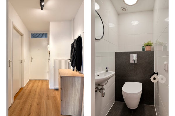 De hal is afgewerkt met een nette laminaatvloer die doorloopt in vrijwel alle ruimtes (met uitzondering van de badkamer). Hier bevinden zich de video-intercom, de toiletruimte en de kast met c.v.-opstelling (Remeha, 2019).
