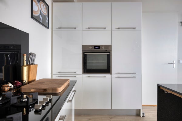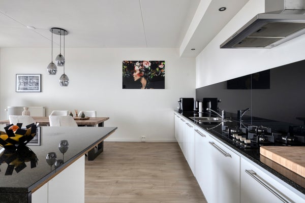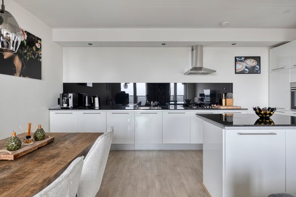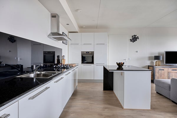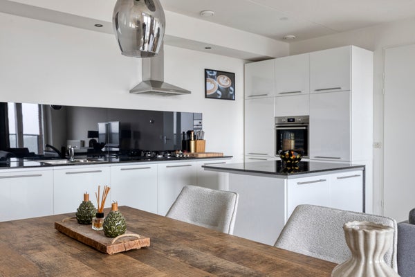 De open luxe keuken sluit hier perfect op aan: strak, compleet en uitgerust met moderne inbouwapparatuur (2025), waaronder een ingebouwde oven, koel-/vriescombinatie, vaatwasser en recirculatieafzuigkap.