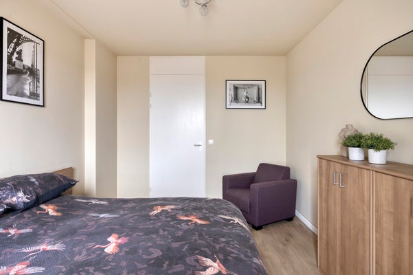 - De portiekflat heeft een woonoppervlakte van 100 m² en beschikt over 3 kamers, waarvan 2 slaapkamers;