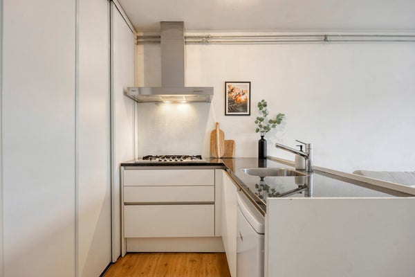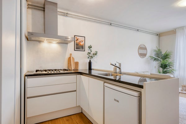 De woonkamer is prettig licht dankzij het grote raam aan de voorzijde. Hier is voldoende ruimte voor zowel een zit- als eethoek. De open keuken sluit hier direct op aan en is uitgevoerd in een praktische L-opstelling, voorzien van gaskookplaat (incl. wokbrander), afzuigkap, spoelbak, koelkast en bergruimte.