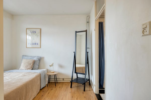 De slaapkamer is rustig gelegen en biedt ruimte voor een tweepersoonsbed en kastruimte.