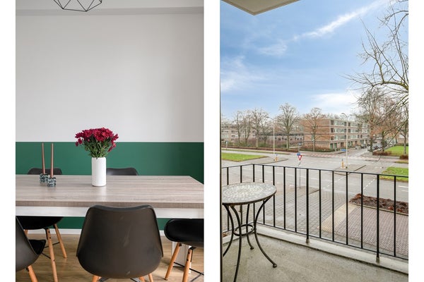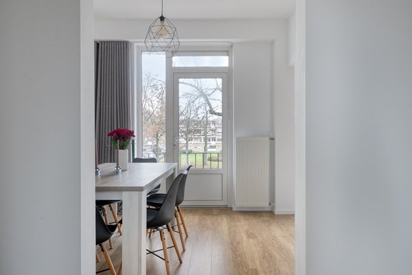 Ruime L-vormige woonkamer verdeeld in een eetkamer met toegang tot balkon en een lichte woonkamer met grote raampartij, originele schouw en inbouwnis. Strakke stucwerkwanden en -plafond en alle c.v.-leidingen weggewerkt.