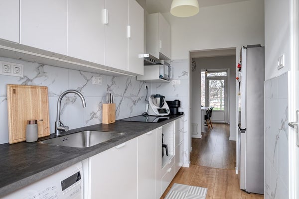 Open keuken (december 2025) met moderne, witte opstelling met marmerlook achterwand. Voorzien van spoelbak, vaatwasser, inductie kookplaat, afzuigkap en wasmachine. Deur naar het royale balkon aan de achterzijde met een vrij en groen uitzicht over een ruim grasveld.