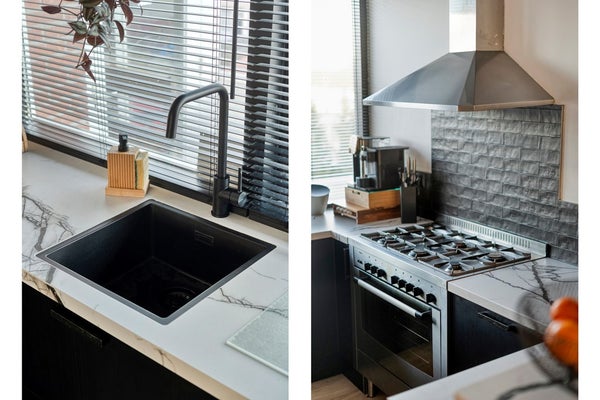 In 2023 is de complete keuken vernieuwd: strak keramieken blad, 6-pits gaskookplaat met oven, een flinke afzuigkap, vaatwasser en – jawel – een imposante Amerikaanse koelkast die eventueel kan blijven staan.
