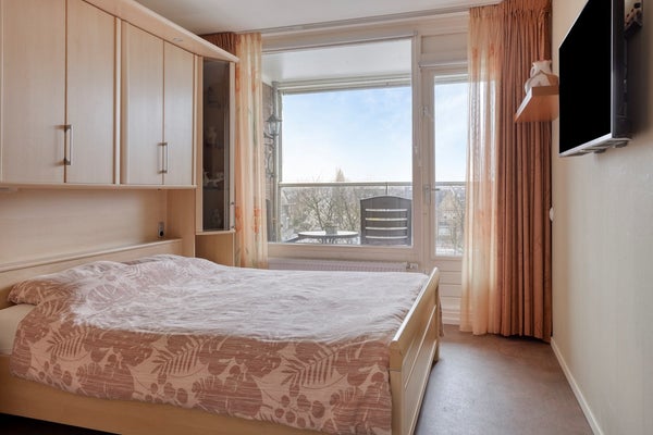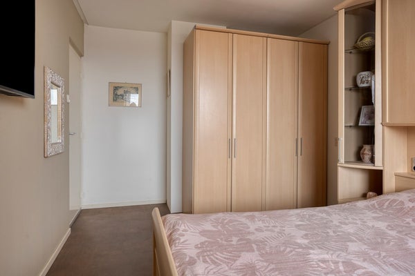 Aansluitend aan de woonkamer bevindt zich de eerste ruime slaapkamer met toegang tot een balkon en een vrij uitzicht, ideaal voor een rustige en lichte slaapomgeving. De tweede slaapkamer is eveneens vanuit de woonkamer bereikbaar en beschikt, net als de eerste, over een eigen balkon waardoor meerdere vertrekken directe toegang hebben tot de buitenruimte.