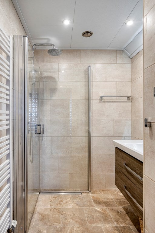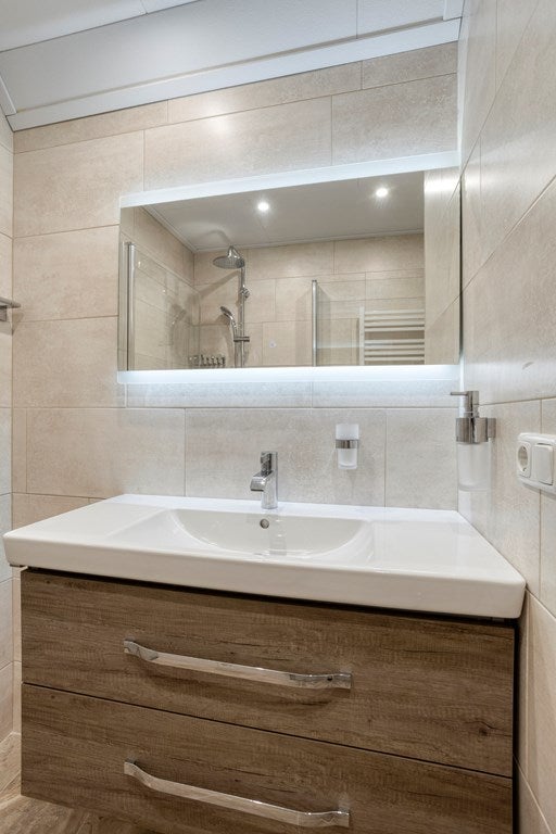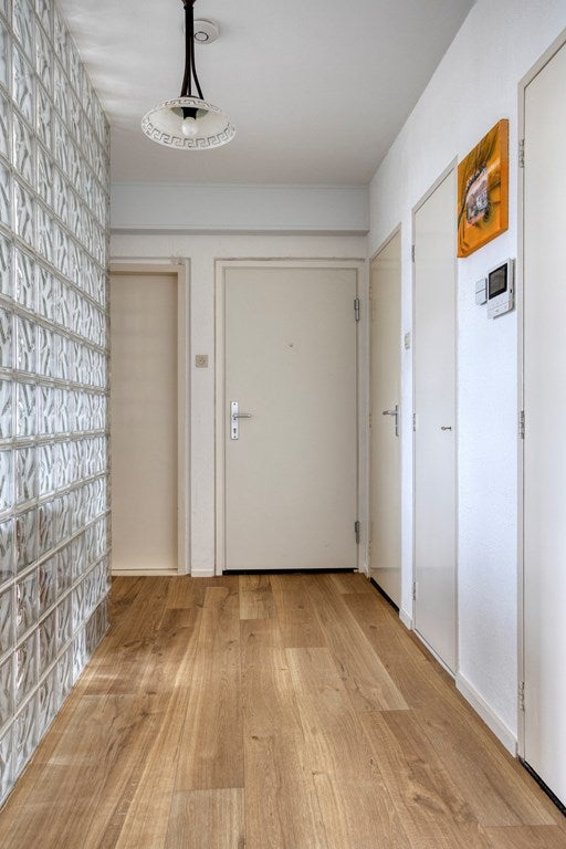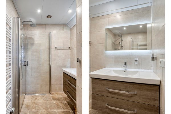 Via de entree betreedt u het appartement, waar u in de hal toegang heeft tot het toilet en de recent vernieuwde badkamer. Deze is modern en netjes afgewerkt en voorzien van een comfortabele inloopdouche, een groot wastafelmeubel met een stijlvolle verwarmde en verlichte spiegel.