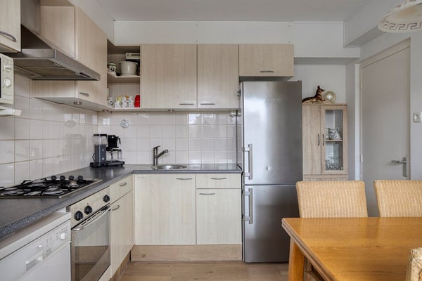 De keuken is bereikbaar vanuit de woonkamer, heeft een praktische indeling en voldoende ruimte voor een eethoek. De perfecte plek voor het ontbijt. Vanuit de keuken is er toegang tot het derde balkon, waar zich tevens een handige berging bevindt.