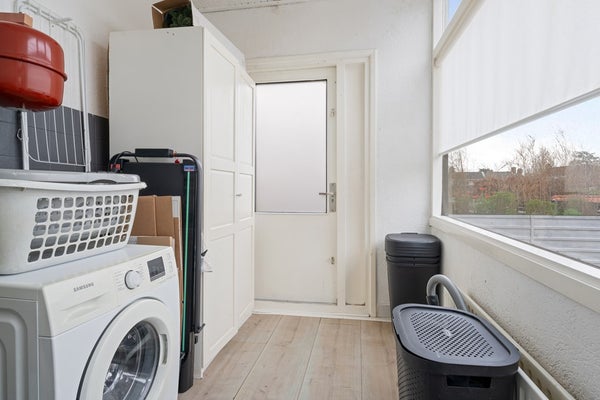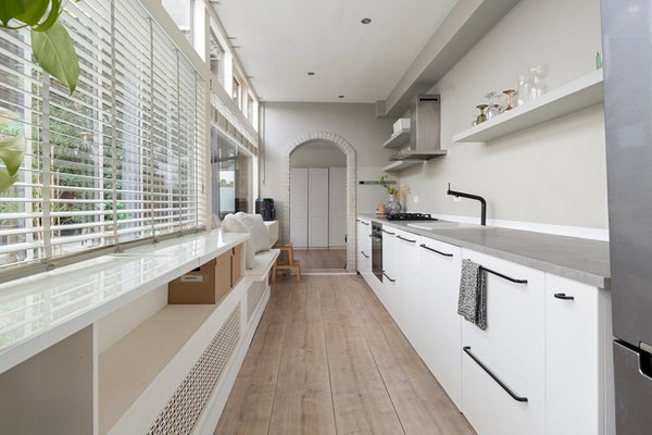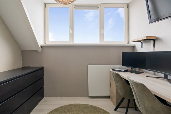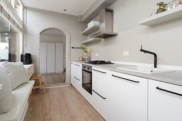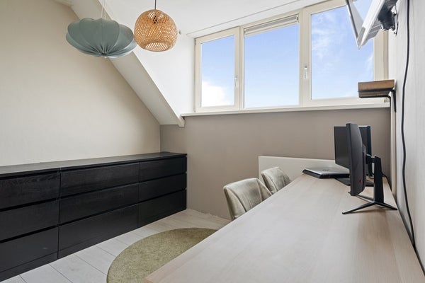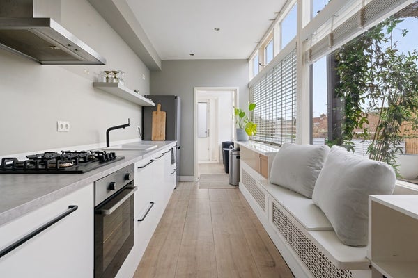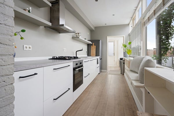Aan de woonkamer grenst een keuken waar iedere hobbychef vrolijk van wordt. Ruimte genoeg om nieuwe recepten uit te proberen, met handige aansluitingen en extra opbergruimte in de bijkeuken. Terwijl jij staat te kokkerellen, hebben je huisgenoten genoeg ruimte om gezellig bij te praten – of ze nu genieten op het dakterras of alvast aanschuiven aan tafel.