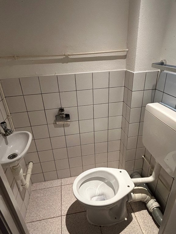 Toiletruimte 1,30 x 0,85 met plavuizenvloer, duoblok en wastafel.