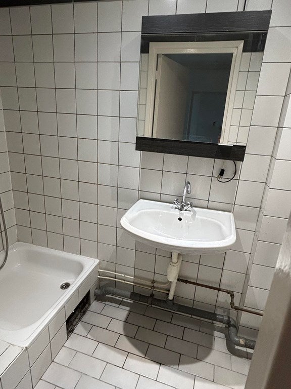 Badkamer 1,95 x 1,30 met tegelvloer, inbouwspots, douche en wastafel.