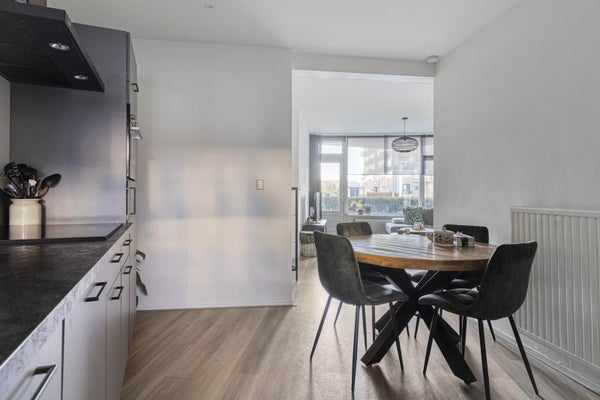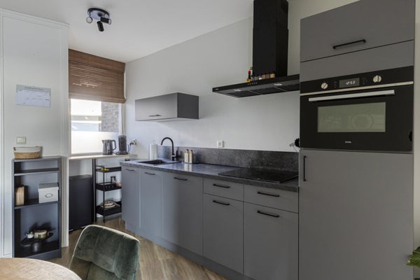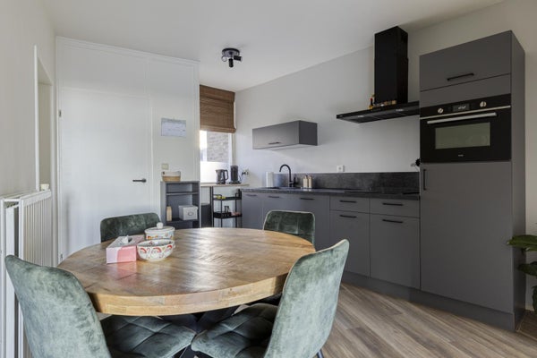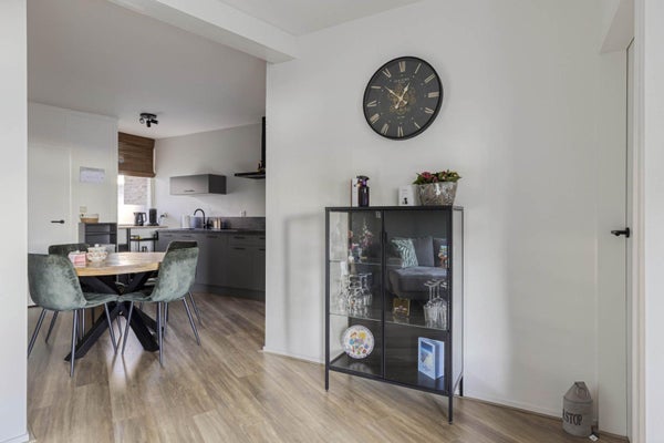 Je komt binnen in de hal met meterkast en toilet. De moderne keuken bevindt zich aan de voorzijde en is uitgevoerd in een tijdloos design. De keuken is voorzien van diverse inbouwapparatuur, waaronder een inductiekookplaat, afzuigkap, koelkast, combi-magnetron en vaatwasser. Er is voldoende ruimte voor een compacte eethoek. Aansluitend is er een praktische bijkeuken/inpandige berging met cv-opstelling, wasmachineaansluiting en extra bergruimte.