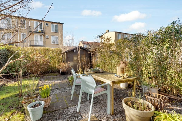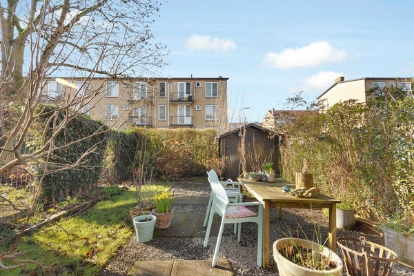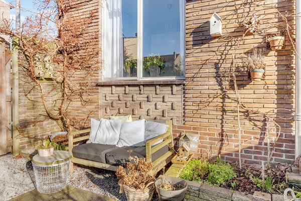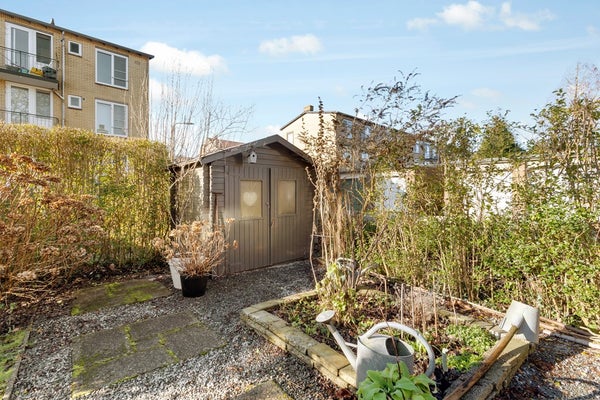 De riante achtertuin van ruim 11m diep ligt op het zuidoosten en heeft een oppervlak van maar liefst ruim 72 m². Achterin de tuin is de berging en aan de zijkant is een toegangshek.