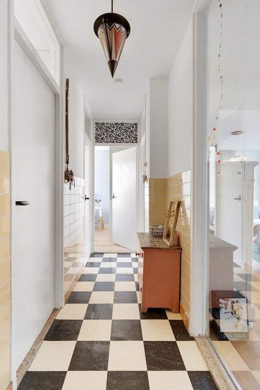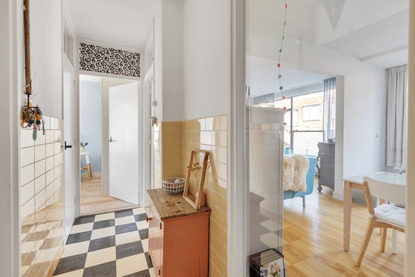 De voordeur van het appartement bevindt zich rechtuit en geeft toegang tot de ruime hal, met daarin de meterkast en toegang tot de keuken, het toilet, de woonkamer en de slaapkamer.