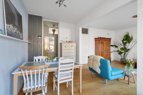 De woonkamer meet ruim 17 m² en is verbonden met de open eetkamer van bijna 10 m², wat het totaal oppervlak maar liefst 27 m² maakt. Door de vele ramen, inclusief een zijraam, is er veel licht binnen. Op de vloer van de woonkamer en eetkamer ligt hout.