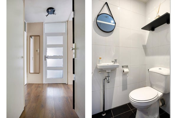 Entree/hal met meterkast (4 groepen + ALS), cv-kast, ruime inpandige berging en een volledig betegelde toiletruimte met een toilet en fonteintje.