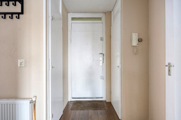 Afgesloten entree met bellenplateau, brievenbussen, toegang bergingen, trappenhuis en lift.
