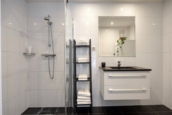 - Moderne volledig licht betegelde badkamer met o.a. een royale inloopdouche.