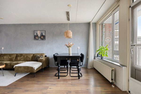 Woonkamer met een mooi uitzicht en toegang tot een op het westen gelegen balkon.