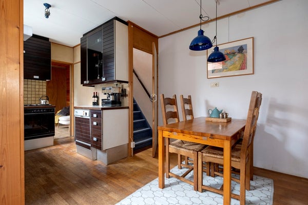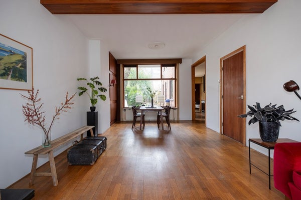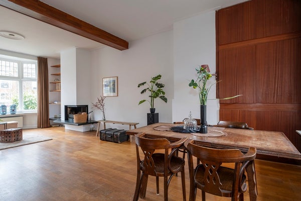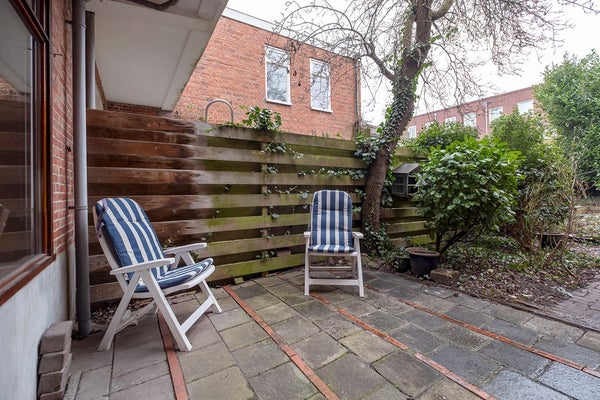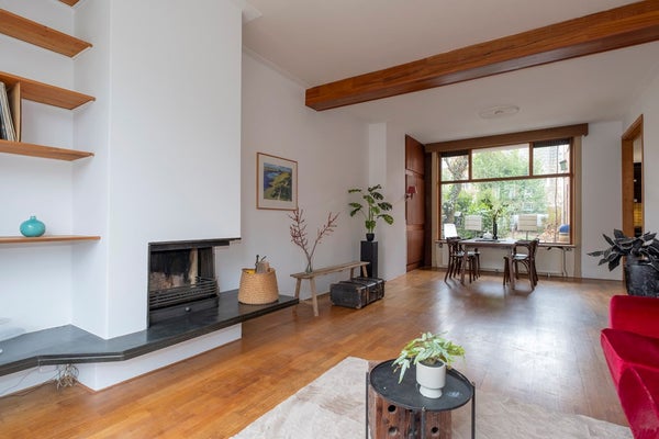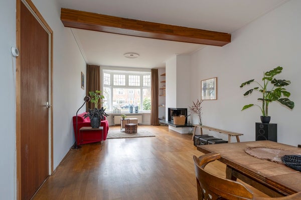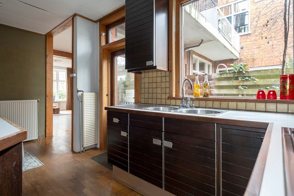De woning zelf is, zoals genoemd, van binnen gedateerd maar heeft absoluut mogelijkheden door de ruime woonkamer en dito open keuken, de uitbouw, met slaapkamer en badkamer en de twee slaapkamers op de verdieping en niet te vergeten de, voor stadse begrippen, ruime achtertuin op zuid! Een plus zijn ook de hoge plafonds die extra sfeer geven.