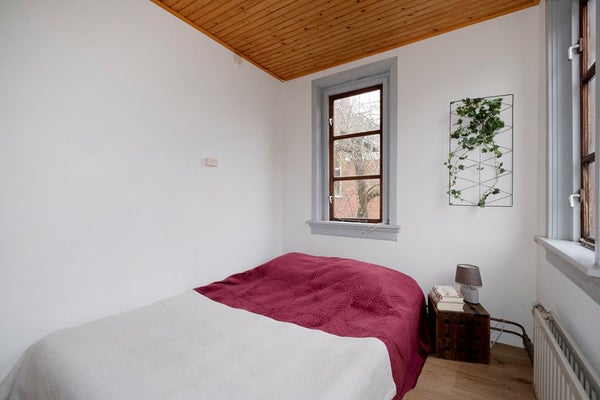 Overloop en twee slaapkamers (ca. 5 en 7 m²) waarvan de slaapkamer aan de achterzijde toegang heeft naar het platte dak van de uitbouw.