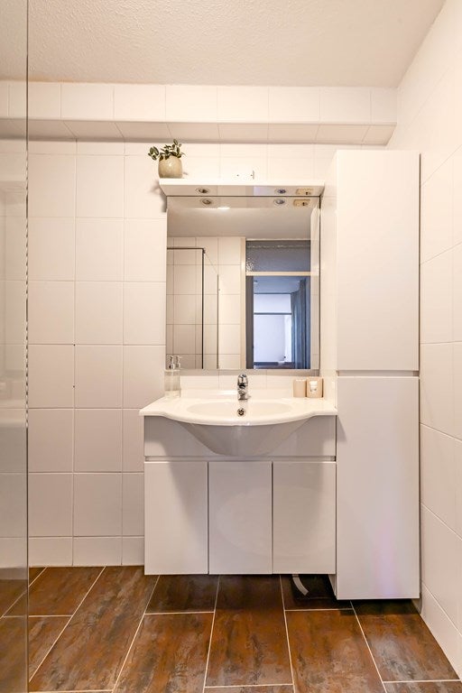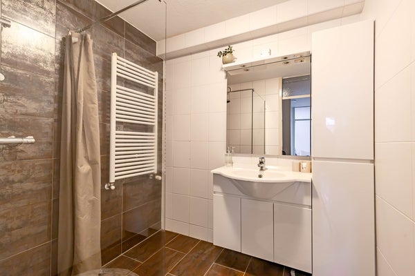 Op de bovenste verdieping vind je de drie slaapkamers en de ruime badkamer. Deze is voorzien van een inloopdouche, wastafelmeubel en handdoekradiator. De sanitaire ruimtes zijn netjes en in dezelfde stijl uitgevoerd wat zorgt voor eenheid in de woning. Tot slot kunnen we nog vermelden dat op de begane grond een inpandige berging is die je vanuit de hal bereikt.