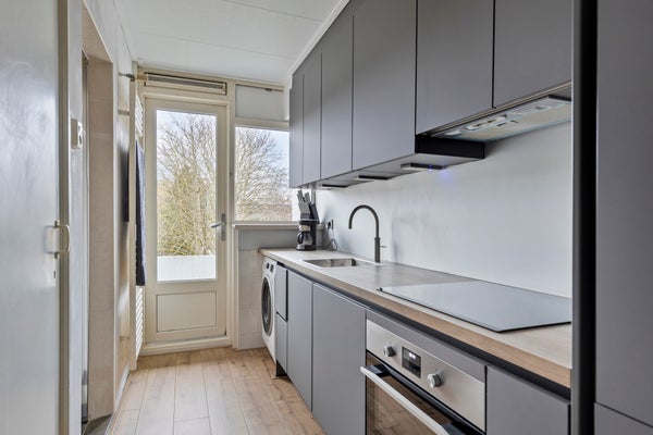 De woonkamer van ca. 22 m² voelt ruim en licht dankzij de grote ramen en het balkon op het zuiden. Wil je meer leefruimte? Dan kun je eenvoudig een slaapkamer bij de woonkamer betrekken. De keuken is modern en voorzien van alle inbouwapparatuur die je nodig hebt – vaatwasser, combimagnetron en koel-/vriescombinatie en een Quooker.